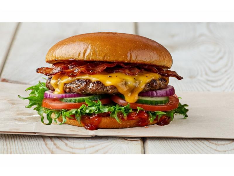 Juicy homestyle burger i briochebrød, med relish, salat, tomat, agurk og løk, toppet med deilig cheddaost og bacon.