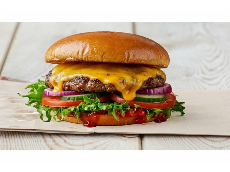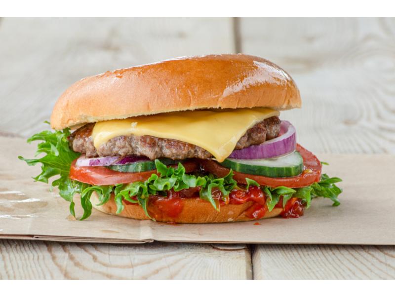 Juicy homestyle burger i briochebrød, med relish, crispysalat, tomat, agurk og løk, toppet med deilig cheddaost.