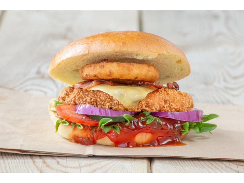 Juicy og sprø kyllingburger av kyllingfilet. Med barbequesaus, salat, tomat, agurk og rødløk. Toppet med deilig cheddarost, bacon. og friterte løkringer.