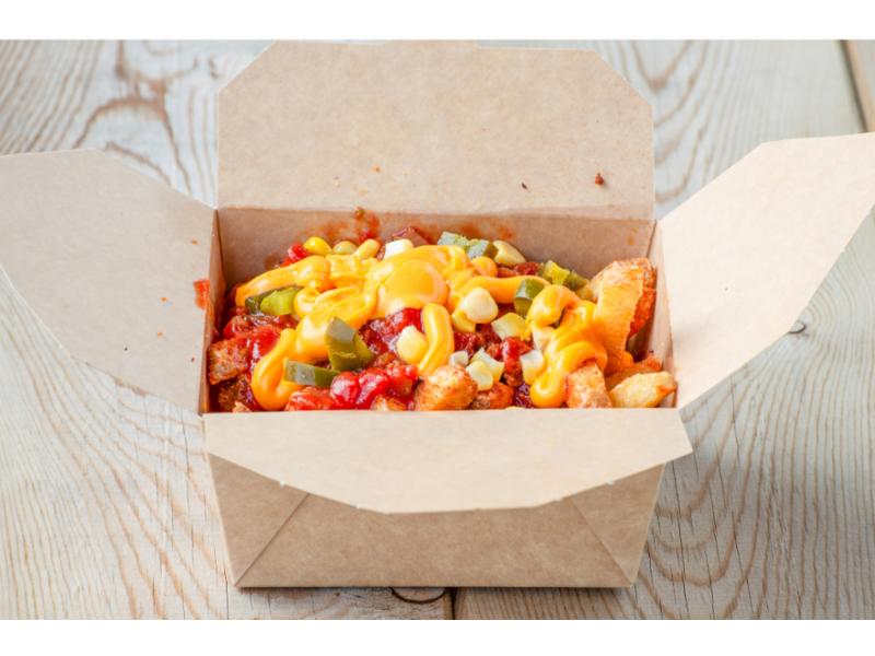 Sprø Fries med tacokjøtt. Toppet med salsa, rød løk, mais, jalapeños, nachos og deilig cheddarsaus.