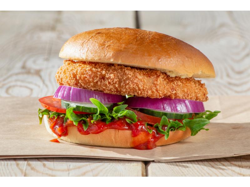Sprø og saftig Plantebasert burger i briochebrød. Med relish, crispysalat, tomat, agurk og rødløk.