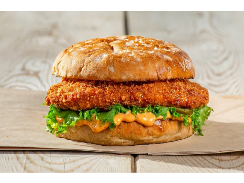 Crunchy og juicy hel kylling brystfilet i gourmetrød, med spicy mayodressing og salat.