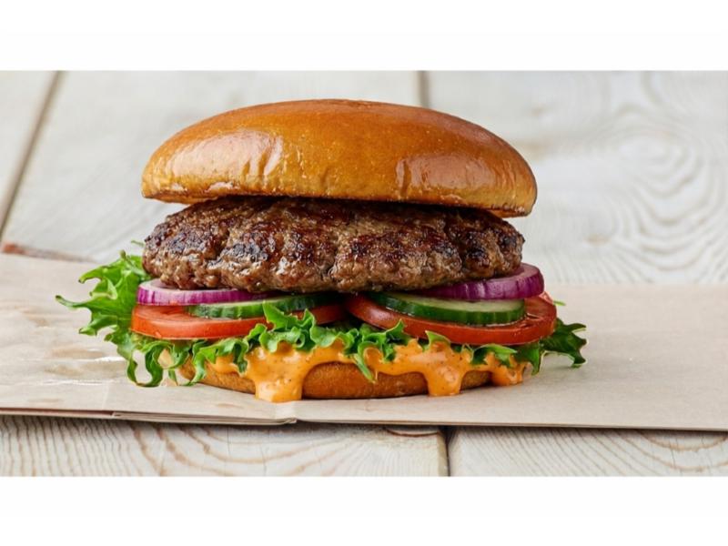 Juicy Homestyle burger i briochebrød, med klassisk hamburgerdressing, salat, tomat, agurk og rødløk.