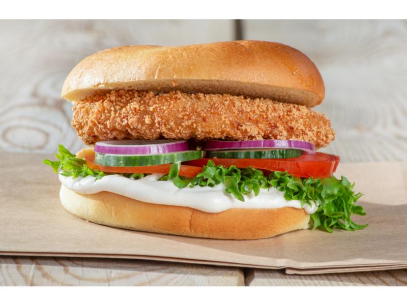 Juicy og sprø kyllingburger av kyllingfilet i Briochebrød. Med aiolidressing, crispysalat, tomat, agurk og rødløk