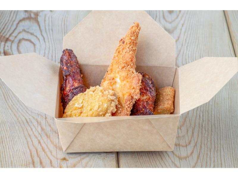 Utvalg av friterte kyllingbiter.. 2x Nuggets, 2x Buffalo Wings, 2x Boneless leg bites, 1x Tender Filet