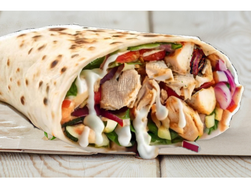 Wrap med slicet fritert kyllingkjøtt, bacon, crispy salat, tomat, agurk, rødløk, mais og deilig hvitløksdressing.