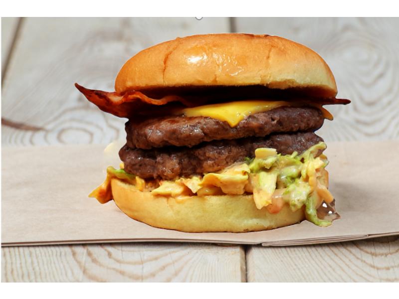 Juicy dobbel homestyle burger i briochebrød, med Texas coleslaw. Toppet med deilig cheddaost og bacon.