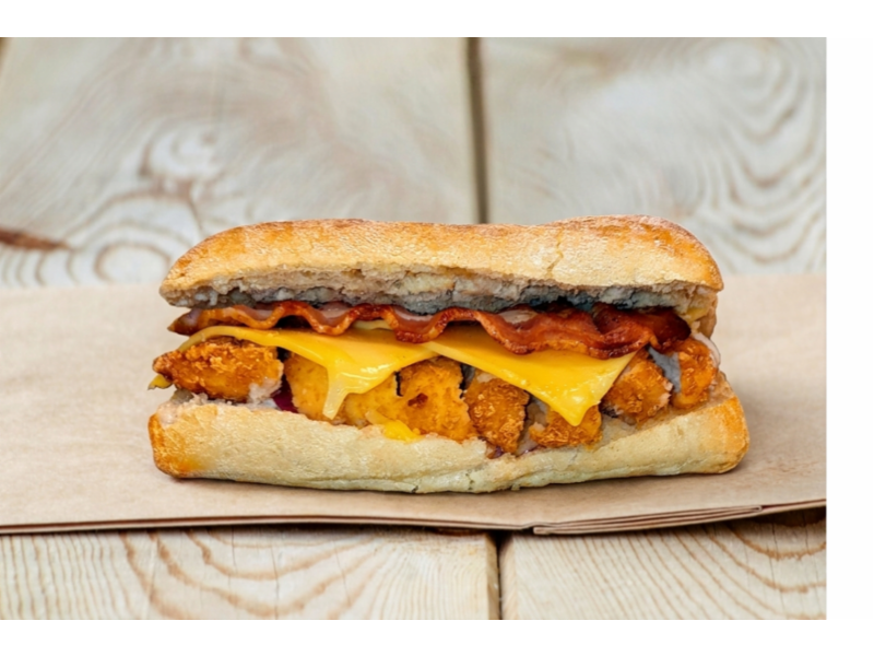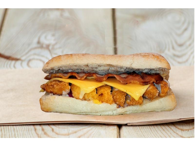 Varm sandwich med kylling indrefilet, aiolidressing, løk og Bacon